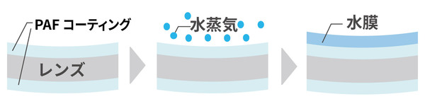 親水性コーティングとは、レンズ表面に付着した水蒸気を薄い水膜として均一に広げる技術です。これにより